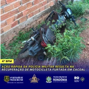 Na manhã de sexta-feira (03), por volta das 7h, a Polícia Militar recuperou uma motocicleta furtada no bairro Jardim Clodoaldo, em Cacoal. O veículo foi localizado durante patrulhamento de rotina, em um terreno baldio na Rua Floriano Peixoto.