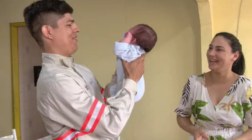 Depois do susto, Odacir teve a oportunidade de reencontrar o bebê em uma situação bem diferente: pôde segurá-lo nos braços com calma, já fora de perigo, um momento marcado pela emoção e pela certeza de que sua atitude fez toda a diferença.