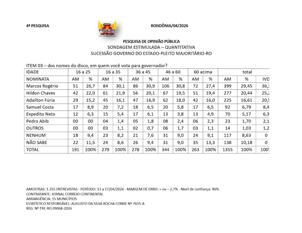 O levantamento foi realizado entre os dias 13 e 17 de abril de 2026, com 1.355 entrevistas em 15 municípios de Rondônia. A margem de erro é de ±2,7%, com nível de confiança de 96%.