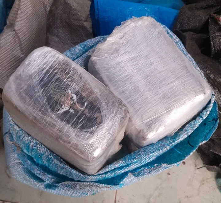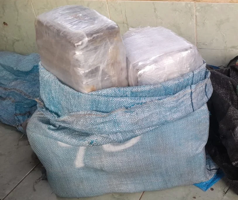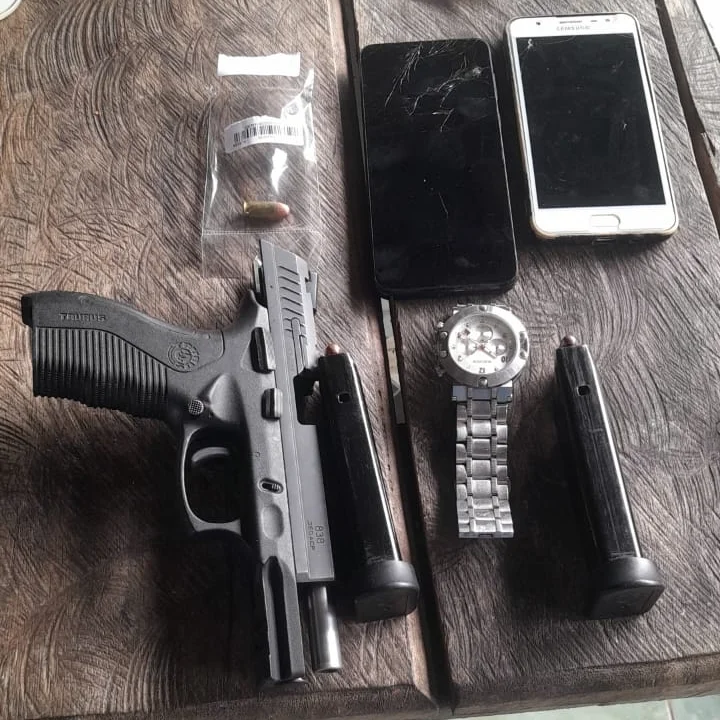 Durante as buscas, os policiais localizaram, em um cômodo externo do imóvel, um saco contendo aproximadamente 33 quilos de substância análoga à maconha, além de sacos utilizados para o acondicionamento do entorpecente. No mesmo ambiente, foi encontrada uma motoneta sem placa de identificação, onde, após vistoria, foi apreendida uma pistola calibre .380, acompanhada de carregadores e munições, além de aparelhos celulares.