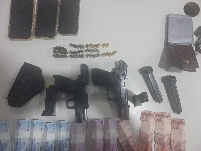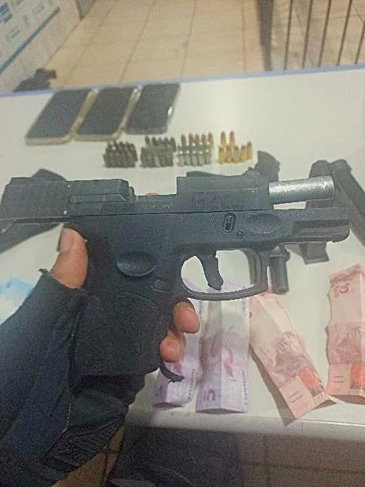 Ao todo, foram apreendidos R$ 265 em dinheiro, duas pistolas (calibres .380 e 9mm), diversos carregadores, dezenas de munições, dois veículos e vários aparelhos celulares.