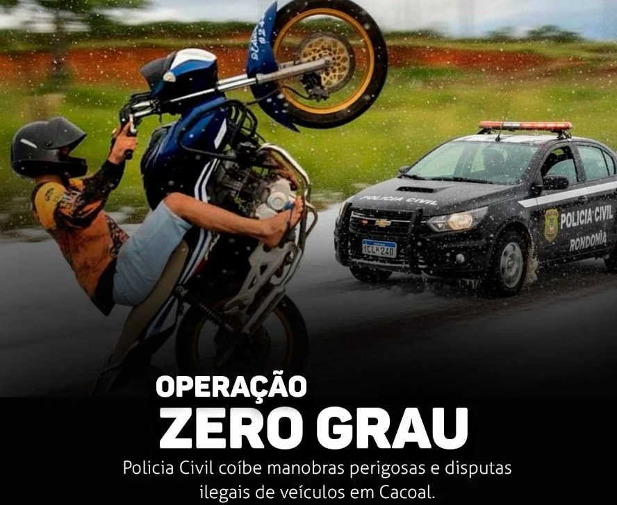 A Polícia Civil de Rondônia, na data de hoje, realizou a operação denominada “Zero Grau”, com o objetivo de coibir a prática de “rolezinhos”, manobras perigosas conhecidas como “grau” e disputas automobilísticas ilegais, popularmente chamadas de rachas. A ação consistiu no cumprimento de mandados de busca e apreensão, fundamentados em denúncias e levantamentos técnicos de inteligência, resultando na apreensão de automóveis e, principalmente, motocicletas utilizadas por condutores que reiteradamente praticavam infrações de trânsito, colocando em risco a própria integridade física e a de terceiros.