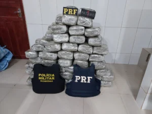 Durante a busca veicular, os policiais localizaram aproximadamente 1 kg de substância análoga à skank no interior do automóvel. Já na carroceria da caminhonete, foram encontrados cerca de 183,2 kg do mesmo entorpecente, acondicionados em sacos de ráfia, totalizando 170 pacotes.