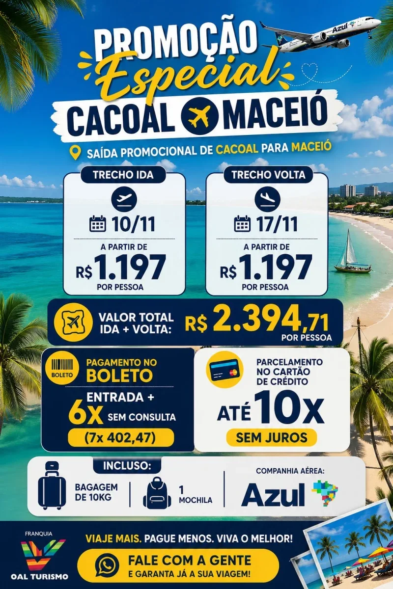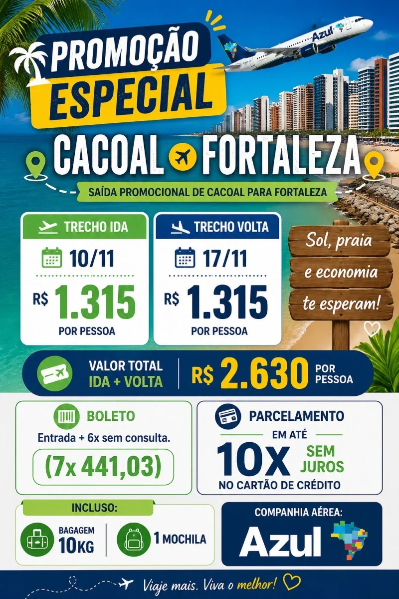 Uma promoção de passagens aéreas tem chamado a atenção de moradores de Cacoal que desejam viajar para o Nordeste brasileiro. A campanha, divulgada pela Vai Voando Cacoal, oferece pacotes com preços especiais para Fortaleza e Maceió, com voos operados pela Azul Linhas Aéreas Brasileiras.