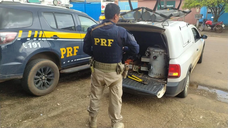 Na inspeção da carroceria, os agentes localizaram um transformador de energia elétrica sendo transportado. Ao serem questionados sobre a procedência do equipamento, os dois ocupantes do veículo não conseguiram apresentar documentação ou comprovar a origem do material.